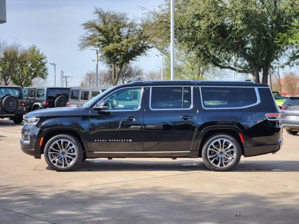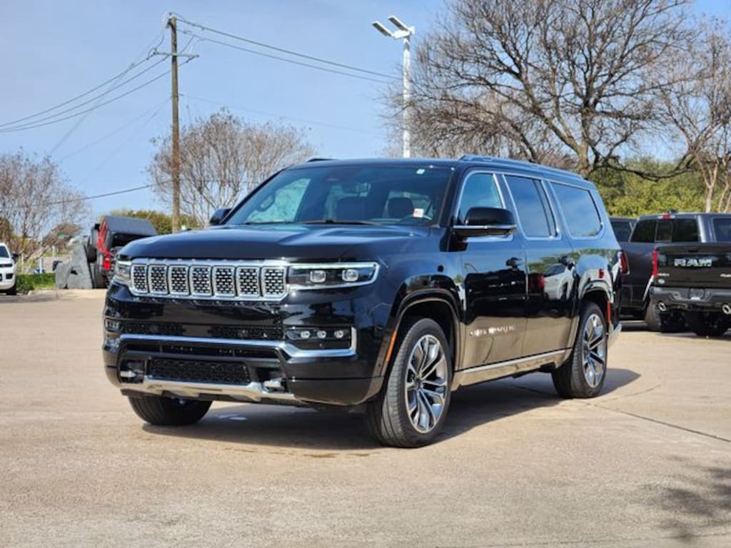 Certified. CARFAX One-Owner. Clean CARFAX. Diamond Black Crystal Pearlcoat 2025 Jeep Grand Wagoneer L Series III Series III 8-Speed Automatic 3.0L I6 4WD HD Trailer Tow Package (Heavy-Duty Engine Cooling, Removable Rear Tow Hook, Trailer Brake Control, and Trailer Hitch Zoom), MOPAR Interior Protection Package (All-Season Floor Mats and Cargo Tray), Quick Order Package 28W, Two Tone Paint Group, FCA US LLC Certified Pre-Owned Certified, 3.92 Rear Axle Ratio, 3rd row seats: bench, 4-Wheel Disc Brakes, ABS brakes, Adjustable pedals, Air Conditioning, Alloy wheels, AM/FM radio: SiriusXM with 360L, Anti-whiplash front head restraints, Apple CarPlay/Android Auto, Audio memory, Auto High-beam Headlights, Auto-dimming door mirrors, Auto-dimming Rear-View mirror, Auto-leveling suspension, Automatic temperature control, Body Color Roof w/2T, Brake assist, Bumpers: body-color, Compass, Delay-off headlights, Driver door bin, Driver vanity mirror, Driver's Seat Mounted Armrest, Dual front impact airbags, Dual front side impact airbags, Electronic Stability Control, Emergency communication system: Jeep Connect, Four wheel independent suspension, Front anti-roll bar, Front Bucket Seats, Front Center Armrest w/Storage, Front dual zone A/C, Front fog lights, Front reading lights, Fully automatic headlights, Garage door transmitter, Genuine wood console insert, Genuine wood dashboard insert, Genuine wood door panel insert, Heads-Up Display, Heated door mirrors, Heated front seats, Heated rear seats, Heated steering wheel, Illuminated entry, Knee airbag, Leather steering wheel, Low tire pressure warning, Memory seat, Navigation System, Night vision lights, Normal Duty Suspension, Occupant sensing airbag, Outside temperature display, Overhead airbag, Overhead console, Panic alarm, Passenger door bin, Passenger seat mounted armrest, Passenger vanity mirror, Pedal memory, Power adjustable front head restraints, Power door mirrors, Power driver seat, Power Liftgate, Power moonroof, Power passenger seat, Power steering, Power windows, Premium Leather Trimmed Bucket Seats, Radio data system, Radio: Uconnect 5 Nav w/12.0" Display, Rain sensing wipers, Rear air conditioning, Rear anti-roll bar, Rear dual zone A/C, Rear reading lights, Rear seat center armrest, Rear window defroster, Rear window wiper, Reclining 3rd row seat, Remote keyless entry, Roof rack, Security system, Speed control, Speed-sensing steering, Speed-Sensitive Wipers, Split folding rear seat, Steering wheel memory, Steering wheel mounted audio controls, Tachometer, Telescoping steering wheel, Tilt steering wheel, Traction control, Trip computer, Turn signal indicator mirrors, Variably intermittent wipers, Ventilated front seats, Ventilated rear seats, Voltmeter, and Wheels: 22" x 9.0" Painted Aluminum.