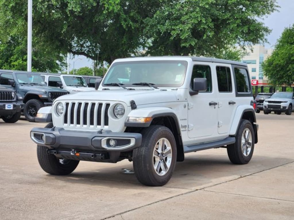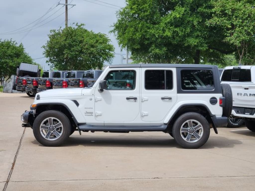 Clean CARFAX. Bright White Clearcoat 2018 Jeep Wrangler Unlimited Sahara Unlimited Sahara 8-Speed Automatic 2.0L I4 DOHC 4WD Electronic Infotainment System Group (1-Year SiriusXM Guardian Trial, 5-Year SiriusXM Traffic Service, 5-Year SiriusXM Travel Link Service, 8.4" Touchscreen Display, Alpine Premium Audio System, Auto-Dimming Rear-View Mirror, GPS Navigation, HD Radio, Radio: Uconnect 4C Nav w/8.4" Display, Roadside Assistance & 9-1-1 Call, SiriusXM Traffic Plus, and SiriusXM Travel Link), Quick Order Package 23G, Quick Order Package 28G, Trail Rail Management System (Cargo Compartment Floor Mat), 1-Yr SiriusXM Radio Service, 3.45 Rear Axle Ratio, 4-Wheel Disc Brakes, 8 Speakers, ABS brakes, Air Conditioning, Alloy wheels, AM/FM radio: SiriusXM, Apple CarPlay (DISC), Apple CarPlay/Android Auto, Automatic temperature control, Black 3-Piece Hard Top, Brake assist, Cloth Low-Back Bucket Seats, Compass, Delay-off headlights, Driver door bin, Driver vanity mirror, Dual front impact airbags, Dual front side impact airbags, Electronic Stability Control, For More Info, Call 800-643-2112, Freedom Panel Storage Bag, Front anti-roll bar, Front Bucket Seats, Front Center Armrest w/Storage, Front dual zone A/C, Front fog lights, Front reading lights, Fully automatic headlights, Garage door transmitter, Heated door mirrors, Heavy Duty Suspension w/Gas Shocks, Illuminated entry, Integrated roll-over protection, Leather steering wheel, Low tire pressure warning, MOPAR All-Weather Floor Mats, Non-Lock Fuel Cap w/o Discriminator, Occupant sensing airbag, Outside temperature display, Panic alarm, ParkView Rear Back-Up Camera, Passenger door bin, Passenger vanity mirror, Power door mirrors, Power steering, Power windows, Radio data system, Radio: Uconnect 4 w/7" Display, Rear anti-roll bar, Rear reading lights, Rear Window Defroster, Rear Window Wiper/Washer, Remote keyless entry, Security system, SiriusXM Satellite Radio (DISC), Speed control, Split folding rear seat, Steering wheel mounted audio controls, Tachometer, Telescoping steering wheel, Tilt steering wheel, Traction control, Trip computer, Variably intermittent wipers, Voltmeter, and Wheels: 18" x 7.5" Polished w/Gray Spokes.