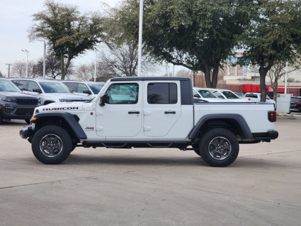 Certified. CARFAX One-Owner. Clean CARFAX. Bright White Clearcoat 2023 Jeep Gladiator Rubicon Rubicon 8-Speed Automatic 3.6L V6 24V VVT 4WD Quick Order Package 23R Rubicon, Quick Order Package 24R Rubicon, Trailer Tow Package (240 Amp Alternator, Class IV Receiver Hitch, Heavy-Duty Engine Cooling, and Trailer Hitch Zoom), FCA US LLC Certified Pre-Owned Certified, 4-Wheel Disc Brakes, 4.10 Rear Axle Ratio, 9 Speakers, 97 MPH Vehicle Max Speed Calibration, ABS brakes, Air Conditioning, Alloy wheels, AM/FM radio: SiriusXM, Apple CarPlay/Android Auto, Auto-dimming Rear-View mirror, Automatic temperature control, Black 3-Piece Hard Top, Brake assist, Compass, Delay-off headlights, Driver door bin, Driver vanity mirror, Dual front impact airbags, Dual front side impact airbags, Electronic Stability Control, Emergency communication system, Freedom Panel Storage Bag, Front anti-roll bar, Front Bucket Seats, Front Center Armrest w/Storage, Front dual zone A/C, Front fog lights, Front License Plate Bracket, Front reading lights, Fully automatic headlights, Garage door transmitter, Heated door mirrors, Illuminated entry, Integrated roll-over protection, Low tire pressure warning, Navigation System, Occupant sensing airbag, Outside temperature display, Panic alarm, ParkView Rear Back-Up Camera, Passenger door bin, Passenger vanity mirror, Performance Suspension, Power door mirrors, Power steering, Power windows, Premium Cloth Low-Back Bucket Seats, Radio data system, Radio: Uconnect 4C Nav w/8.4" Display, Rear anti-roll bar, Rear reading lights, Rear Sliding Window, Rear Window Defroster, Remote keyless entry, Security system, Speed control, Split folding rear seat, Steering wheel mounted audio controls, Tachometer, Telescoping steering wheel, Tilt steering wheel, Traction control, Trip computer, Variably intermittent wipers, Voltmeter, and Wheels: 17" x 7.5" Granite Crystal Aluminum.