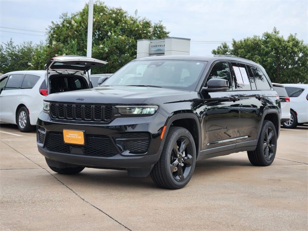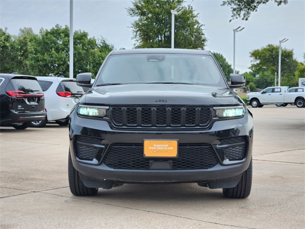CARFAX One-Owner. Clean CARFAX. Diamond Black Crystal Pearlcoat 2023 Jeep Grand Cherokee Altitude X Altitude X 8-Speed Automatic 3.6L V6 24V VVT 4WD Altitude Appearance Package, Quick Order Package 23B Altitude (115V Auxiliary Power Outlet, Black Headliner, Capri Leatherette/Suede Seats, Delete Laredo Badge, Gloss Black Exterior Accents, Heated Front Seats, Heated Steering Wheel, Molded In Color Black/Gloss Black Roof Rails, Power Liftgate, Rain Sensitive Windshield Wipers, Remote Start System, Secondary Active Grille Shutters, Selectable Tire Fill Alert, Wheels: 18" x 8" Fully Painted Aluminum 1, and Wireless Charging Pad), 4WD, 3.45 Rear Axle Ratio, 4-Wheel Disc Brakes, 6 Speakers, ABS brakes, Air Conditioning, Alloy wheels, Anti-whiplash front head restraints, Automatic temperature control, Brake assist, Bumpers: body-color, Cloth Seats, Compass, Delay-off headlights, Driver door bin, Driver vanity mirror, Dual front impact airbags, Dual front side impact airbags, Electronic Stability Control, Emergency communication system, Four wheel independent suspension, Front anti-roll bar, Front Bucket Seats, Front Center Armrest w/Storage, Front dual zone A/C, Front License Plate Bracket, Front reading lights, Fully automatic headlights, Heated door mirrors, Illuminated entry, Knee airbag, Low tire pressure warning, Normal Duty Suspension, Occupant sensing airbag, Outside temperature display, Overhead airbag, Overhead console, Panic alarm, ParkView Rear Back-Up Camera, Passenger door bin, Passenger vanity mirror, Power door mirrors, Power driver seat, Power steering, Power windows, Radio data system, Radio: Uconnect 5 w/8.4" Display, Rear anti-roll bar, Rear reading lights, Rear window defroster, Rear window wiper, Remote keyless entry, Security system, Speed control, Speed-Sensitive Wipers, Split folding rear seat, Spoiler, Steering wheel mounted audio controls, Tachometer, Telescoping steering wheel, Tilt steering wheel, Traction control, Trip computer, Variably intermittent wipers, Voltmeter, Wheels: 17" x 6.5" Fully Painted Aluminum, and Wheels: 20" x 8.5" Gloss Black Painted Aluminum.