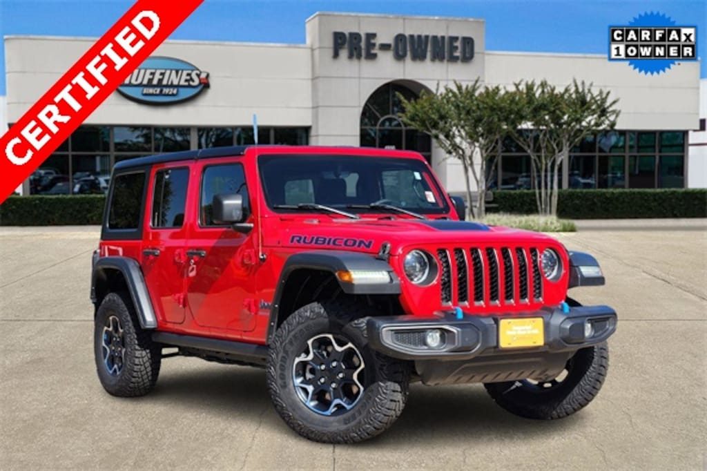 CARFAX One-Owner. Firecracker Red Clearcoat 2023 Jeep Wrangler Rubicon 4xe Rubicon 4xe 8-Speed Automatic 2.0L I4 DOHC 4WD 2.0L I4 DOHC, ABS brakes, Alloy wheels, Compass, Electronic Stability Control, Front dual zone A/C, Heated door mirrors, Illuminated entry, Low tire pressure warning, Navigation System, ParkView Rear Back-Up Camera, Passenger door bin, Remote keyless entry, Traction control, 4-Wheel Disc Brakes, 4.10 Rear Axle Ratio, 9 Speakers, Air Conditioning, AM/FM radio: SiriusXM, Apple CarPlay/Android Auto, Auto-dimming Rear-View mirror, Automatic temperature control, Brake assist, Delay-off headlights, Driver door bin, Driver vanity mirror, Dual front impact airbags, Dual front side impact airbags, Emergency communication system: SiriusXM Guardian, Front anti-roll bar, Front Bucket Seats, Front Center Armrest w/Storage, Front fog lights, Front reading lights, Fully automatic headlights, Garage door transmitter, Integrated roll-over protection, Occupant sensing airbag, Outside temperature display, Panic alarm, Passenger vanity mirror, Performance Suspension, Power door mirrors, Power steering, Power windows, Premium Cloth Low-Back Bucket Seats, Radio data system, Radio: Uconnect 4C Nav w/8.4" Display, Rear anti-roll bar, Rear reading lights, Security system, Speed control, Split folding rear seat, Steering wheel mounted audio controls, Tachometer, Telescoping steering wheel, Tilt steering wheel, Trip computer, Variably intermittent wipers, Voltmeter, and Wheels: 17" x 7.5" Machined w/Black Pockets.