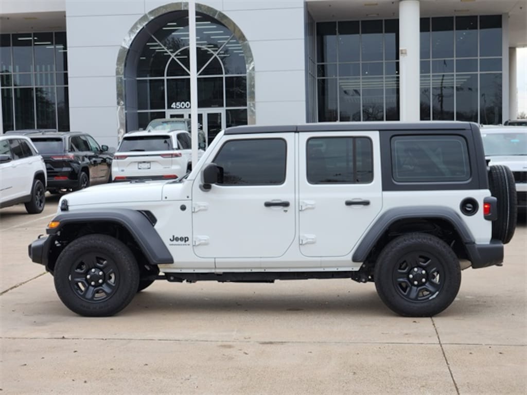 Certified. CARFAX One-Owner. Clean CARFAX. Bright White Clearcoat 2025 Jeep Wrangler Sport Sport 8-Speed Automatic 2.0L I4 DOHC 4WD Quick Order Package 22B Sport, Quick Order Package 23B Sport, FCA US LLC Certified Pre-Owned Certified, 110 MPH Vehicle Max Speed Calibration, 3.45 Overall Top Gear Ratio, 4-Wheel Disc Brakes, 8 Speakers, ABS brakes, Air Conditioning, AM/FM radio: SiriusXM, Apple CarPlay/Android Auto, Aux Battery, Black 3-Piece Hard Top, Brake assist, Cloth Low-Back Bucket Seats, Compass, Delay-off headlights, Driver door bin, Driver vanity mirror, Dual front impact airbags, Dual front side impact airbags, Electronic Stability Control, Freedom Panel Storage Bag, Front anti-roll bar, Front Bucket Seats, Front Center Armrest w/Storage, Front fog lights, Front reading lights, Illuminated entry, Integrated roll-over protection, Low tire pressure warning, MOPAR All-Weather Floor Mats, Non-Lock Fuel Cap w/o Discriminator, Normal Duty Suspension, Occupant sensing airbag, Outside temperature display, Overhead airbag, Panic alarm, ParkView Rear Back-Up Camera, Passenger door bin, Passenger vanity mirror, Power steering, Power windows, Radio data system, Radio: Uconnect 5 w/12.3" Display, Rear anti-roll bar, Rear reading lights, Rear Window Defroster, Rear Window Wiper/Washer, Remote keyless entry, Speed control, Split folding rear seat, Steering wheel mounted audio controls, Stop-Start Dual Battery System, Tachometer, Telescoping steering wheel, Tilt steering wheel, Traction control, Trip computer, Variably intermittent wipers, and Wheels: 17" x 7.5" Black Steel Styled.
