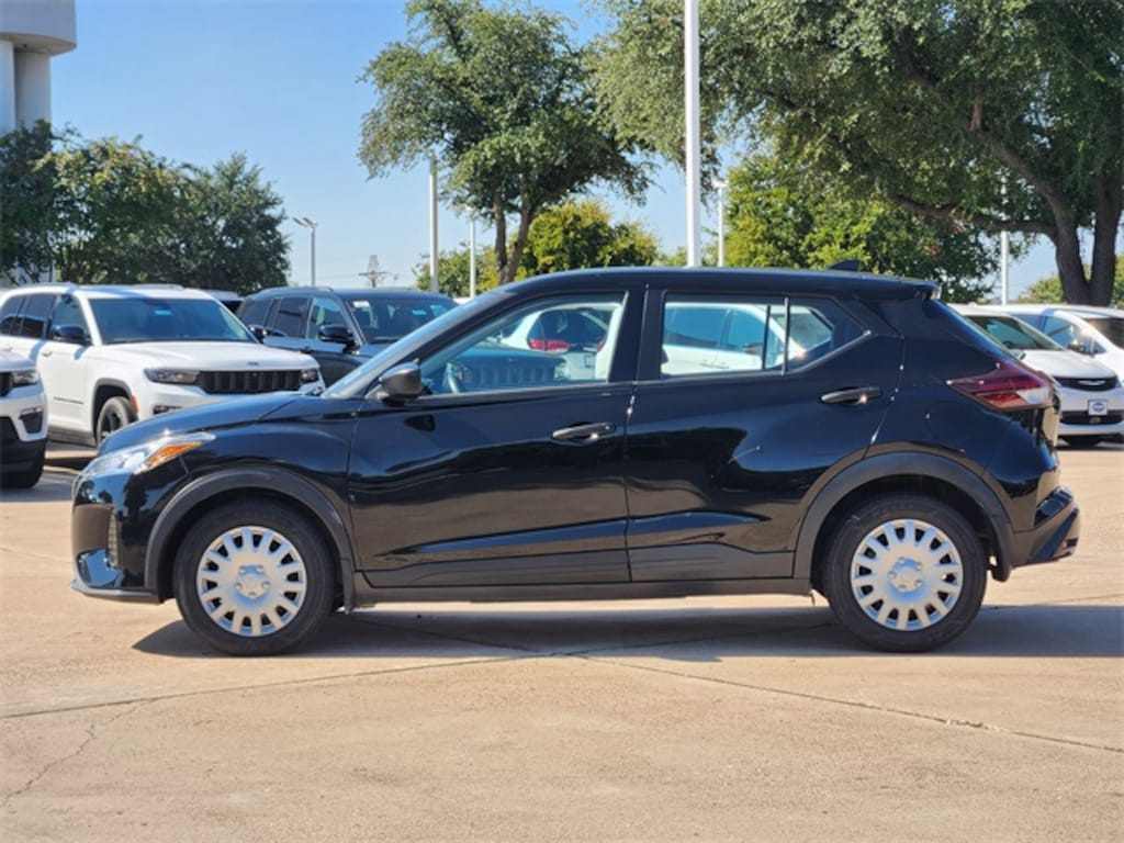 Super Black 2023 Nissan Kicks S S CVT with Xtronic 1.6L 4-Cylinder DOHC 16V FWD 16" Steel Wheels w/Full Covers, 3.93 Axle Ratio, 6 Speakers, ABS brakes, Air Conditioning, AM/FM radio, Apple CarPlay/Android Auto, Auto High-beam Headlights, Blind Spot Warning, Brake assist, Bumpers: body-color, Cloth Seat Trim, Driver door bin, Driver vanity mirror, Driver's Seat Mounted Armrest, Dual front impact airbags, Dual front side impact airbags, Electronic Stability Control, Front anti-roll bar, Front Bucket Seats, Front reading lights, Front wheel independent suspension, Fully automatic headlights, Illuminated entry, Knee airbag, Low tire pressure warning, Occupant sensing airbag, Outside temperature display, Overhead airbag, Panic alarm, Passenger door bin, Passenger vanity mirror, Power door mirrors, Power steering, Power windows, Radio data system, Radio: AM/FM Audio System, Rear Parking Sensors, Rear reading lights, Rear side impact airbag, Rear window defroster, Rear window wiper, Remote keyless entry, Speed control, Split folding rear seat, Sport steering wheel, Steering wheel mounted audio controls, Tachometer, Telescoping steering wheel, Tilt steering wheel, Traction control, Trip computer, and Variably intermittent wipers.